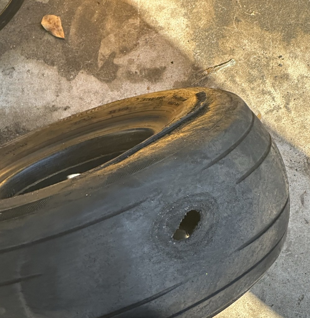 So why write all this? Well, two things can happen when brakes lock and planes come to a stop, even when they make it to the hangar and things are seemingly ok. The first is the most dramatic. The tire may start spinning while the wheel is not. This instantly shears off the insufflation stem from the inner tube and the air is gone. Instant complete flat with subsequent joys associated with that. The other thing that can happen is the tire and wheel both don’t roll. The rubber will get scraped until either the plane stops, the brakes are released or the tire blows. Or all three at the same time. ‘Heels on the ground!’ If not, a traumatic reduction in airplane height above the runway happens and you might be closing the runway down until you get towed off. I hope to use other people’s miserable experience to educate and prevent mishaps like this from happening to those that may read this.